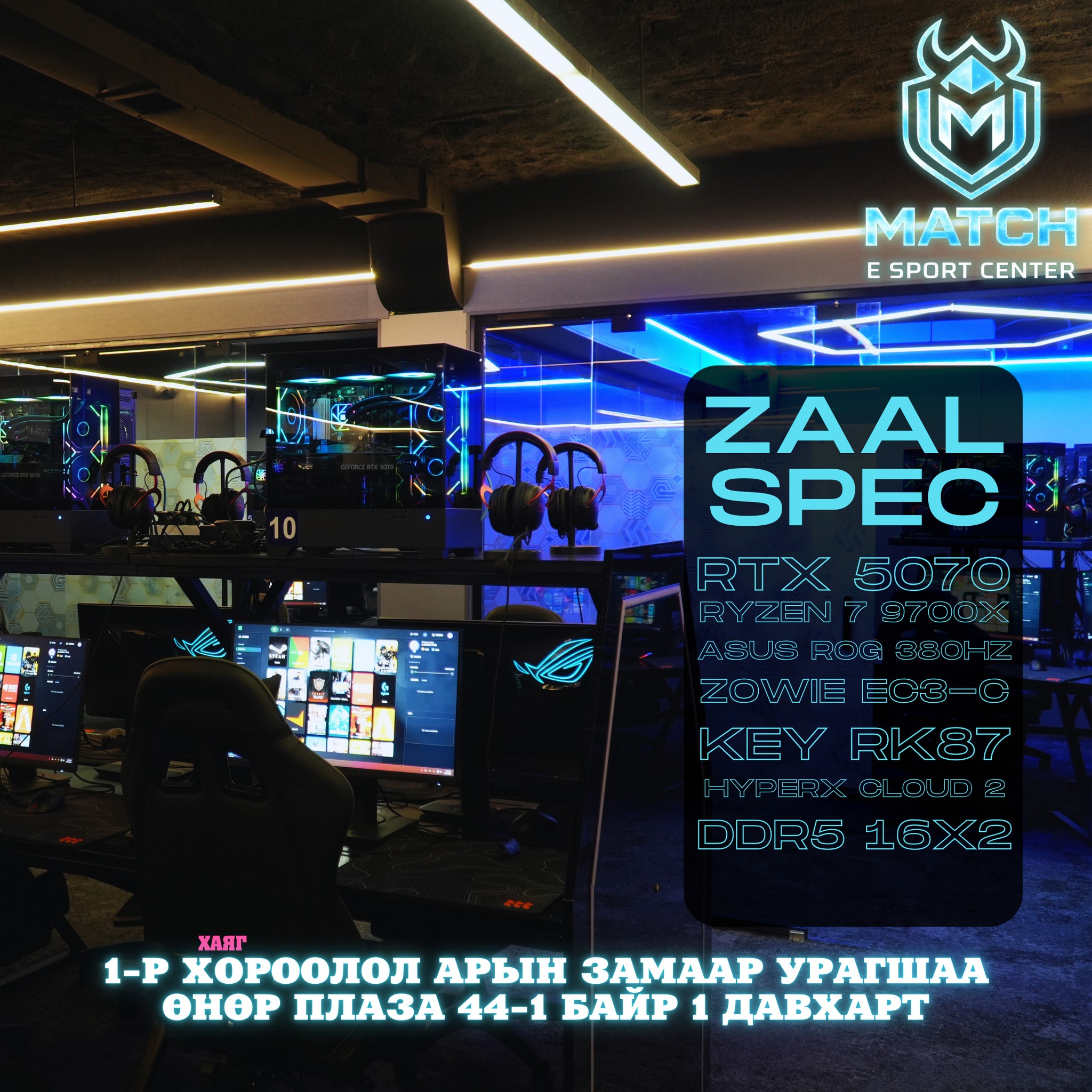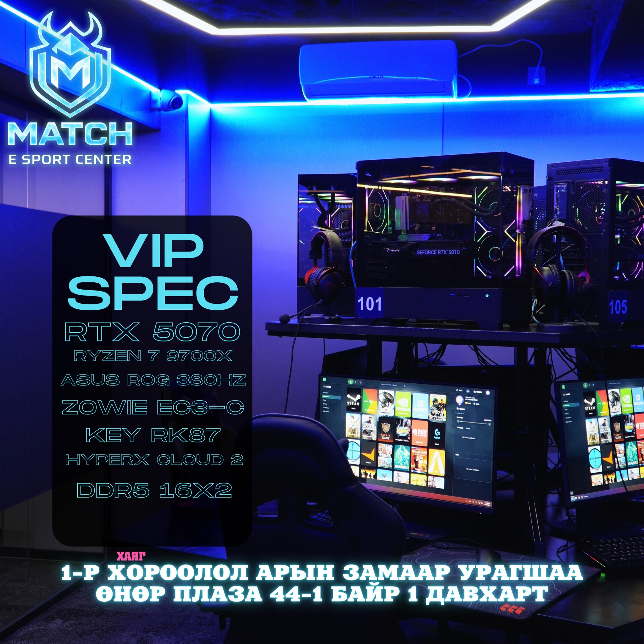 🎮Match E-Sport Center-д Тавтай Морил!🎮 Манай тоглоомын төв нь шинээр нээгдлээ 🔥Агааржуулалт сайтай, сүүлийн үеийн хүчин чадалтай компьютер,тав тухтай орчин таныг хүлээж байна 🔥 Компьютерийн үзүүлэлтээс хамаарч ✅️Заал 1: 4000₮ • CPU - Ryzen 7 9700X • GPU - RTX 5060 • MONITOR - ASUS VG2590M • MOUSE - ZOWIE EC3-C • KEYBOARD - Royal Kludge RK87 • HEADSET - HyperX CLOUD 2 ✅️Заал 2: 5000₮ • CPU - Ryzen 7 9700X • GPU - RTX 5070 • MONITOR - ASUS X6259XMG • MOUSE - ZOWIE EC3-C • KEYBOARD - Royal Kludge RK87 • HEADSET - HyperX CLOUD 2 ✅️VIP: 6000₮ • CPU - Ryzen 7 9700X • GPU - RTX 5070 • MONITOR - ASUS X6259XMG • MOUSE - ZOWIE EC3-C • KEYBOARD - Royal Kludge RK87 • HEADSET - HyperX CLOUD 2 Аккаунт цэнэглэлт 20% бонус Захиалга авах утас: 95133292 📍 Хаяг, байршил: 1-р Хороолол арын замаар урагшаа Өнөр Плаза 44-1 байр 1 давхарт