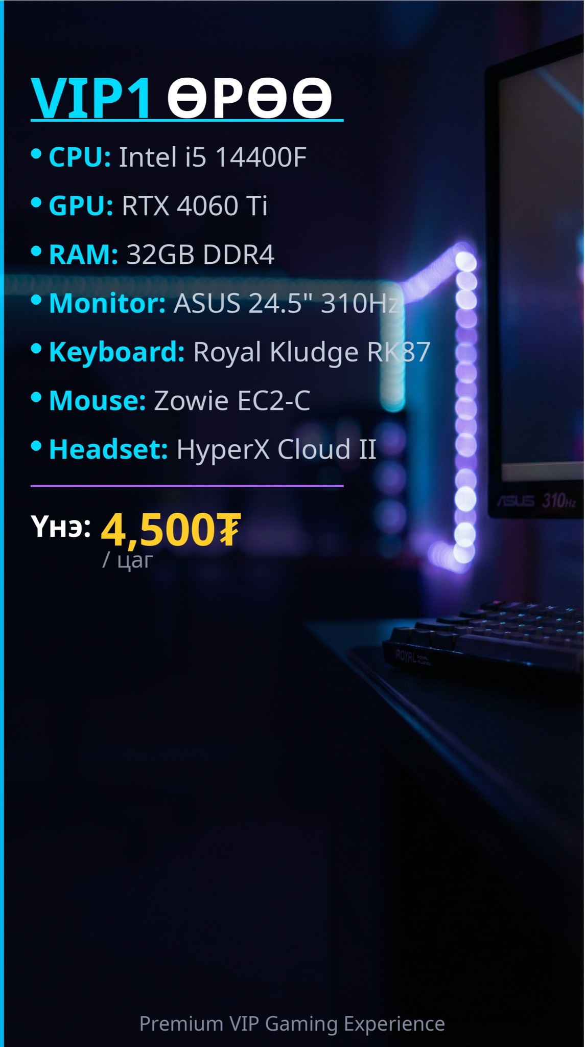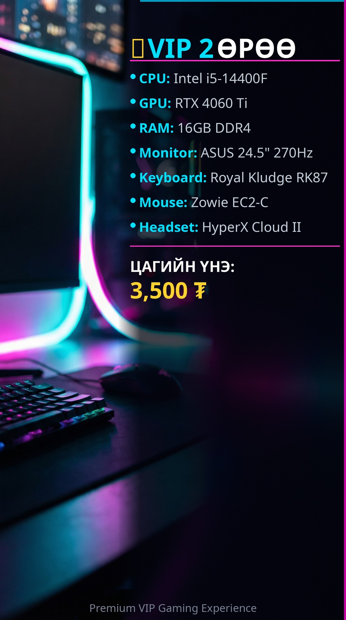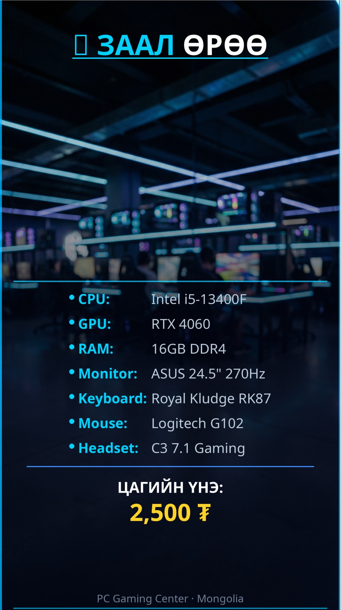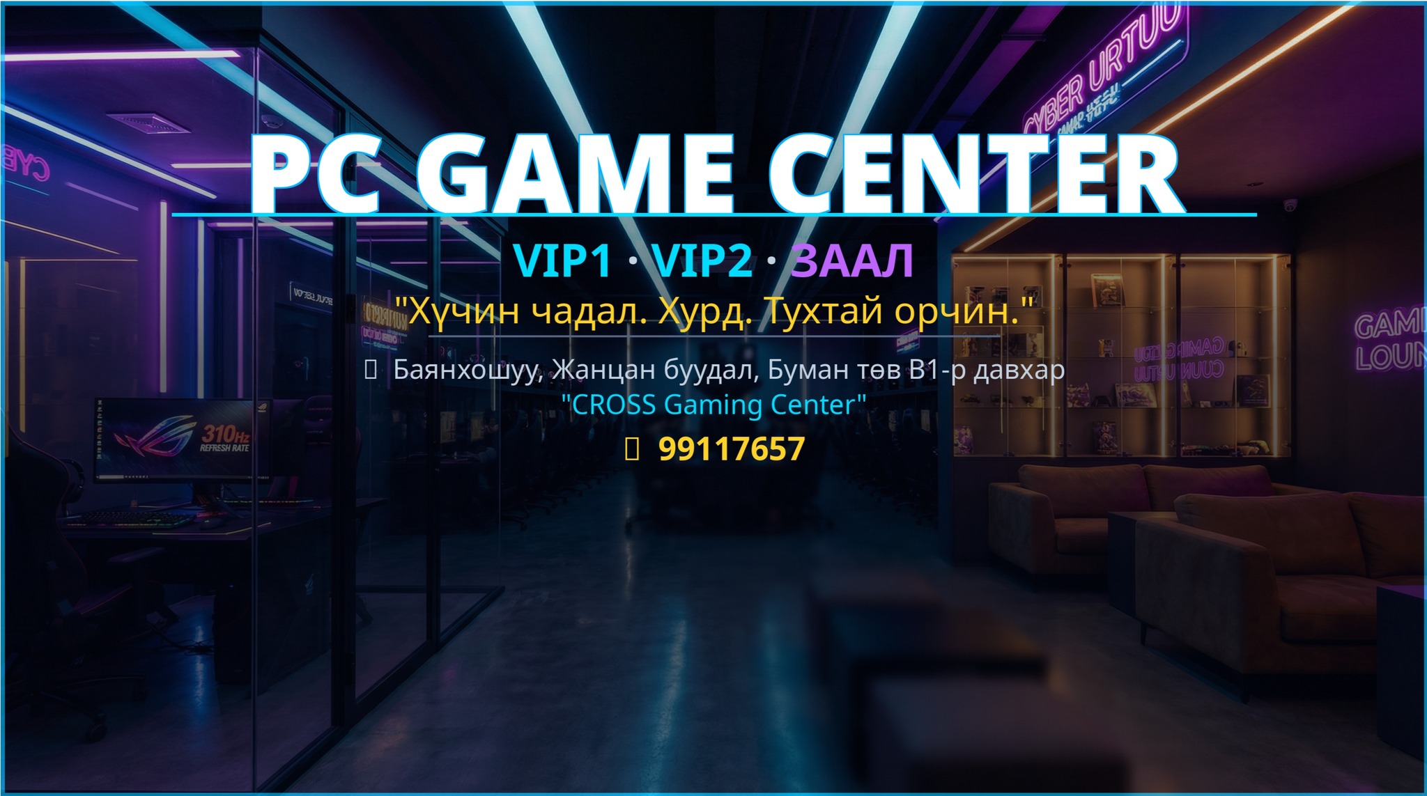 🏆CROSS PC GAMING – БҮХ ӨРӨӨНҮҮД 🏆 ━━━━━━━━━━━━━━━ 🥇 VIP1 🖥️ i5-14400F | RTX 4060 Ti | 32GB | 310Hz ⌨️ RK87 + Zowie EC2-C + HyperX Cloud II 💵 4,500₮/цаг ━━━━━━━━━━━━━━━ 🥈 VIP2 🖥️ i5-14400F | RTX 4060 Ti | 16GB | 270Hz ⌨️ RK87 + Zowie EC2-C + HyperX Cloud II 💵 3,500₮/цаг ━━━━━━━━━━━━━━━ 🥉 ЗААЛ – СТАНДАРТ 🖥️ i5-13400F | RTX 4060 | 16GB | 270Hz ⌨️ RK87 + Logitech G102 + C3 Headset 💵 2,500₮/цаг ━━━━━━━━━━━━━━━ 🎮 БҮХ ӨРӨӨ SHARP 270Hz/310Hz МОНИТОРТОЙ! 🎮 МЕХАНИК KEYBOARD + ПРО МОУС 🔴 НЭЭЛТТЭЙ: Өдөр бүр 09:00 – 23:00 📞 Захиалга: 95501373 📍 Хаяг: Баянхошуу, Жанцан буудал, Буман төв B1-р давхар "Cross PC gaming"